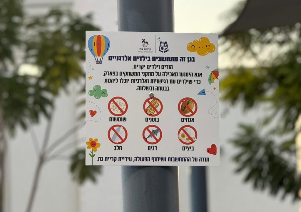 לפי עיריית קריית גת, "התקנת השלטים מגיעה בעקבות פניות של הורים שציינו את החשש מהמזון (חטיפים, כריכים מסוימים או ממתקים), שמסיבות רפואיות עלול להוות סכנה לילדיהם הסובלים מאלרגיות שונות. השלטים מציינים את המזון המסוכן כמו אגוזים, חלב, בוטנים, שומשום, ביצים ודגים העלולים לגרום לתגובה אלרגית חמורה ולעיתים אף לסכן חיים.