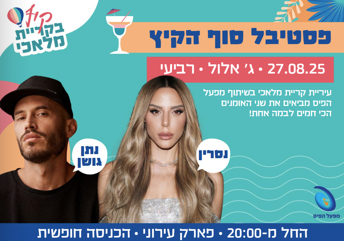 הקיץ בקריית מלאכי נפתח בקול תרועה ובחגיגה ענקית, עם לוח אירועים עשיר ומגוון שהושק על ידי עיריית קריית מלאכי והמתנ"ס המקומי. התושבים מוזמנים ליהנות מקיץ מרגש וגדוש בתוכן, חוויות קהילתיות, מופעים מהשורה הראשונה ופעילויות לכל המשפחה – רובן המכריע ללא תשלום.