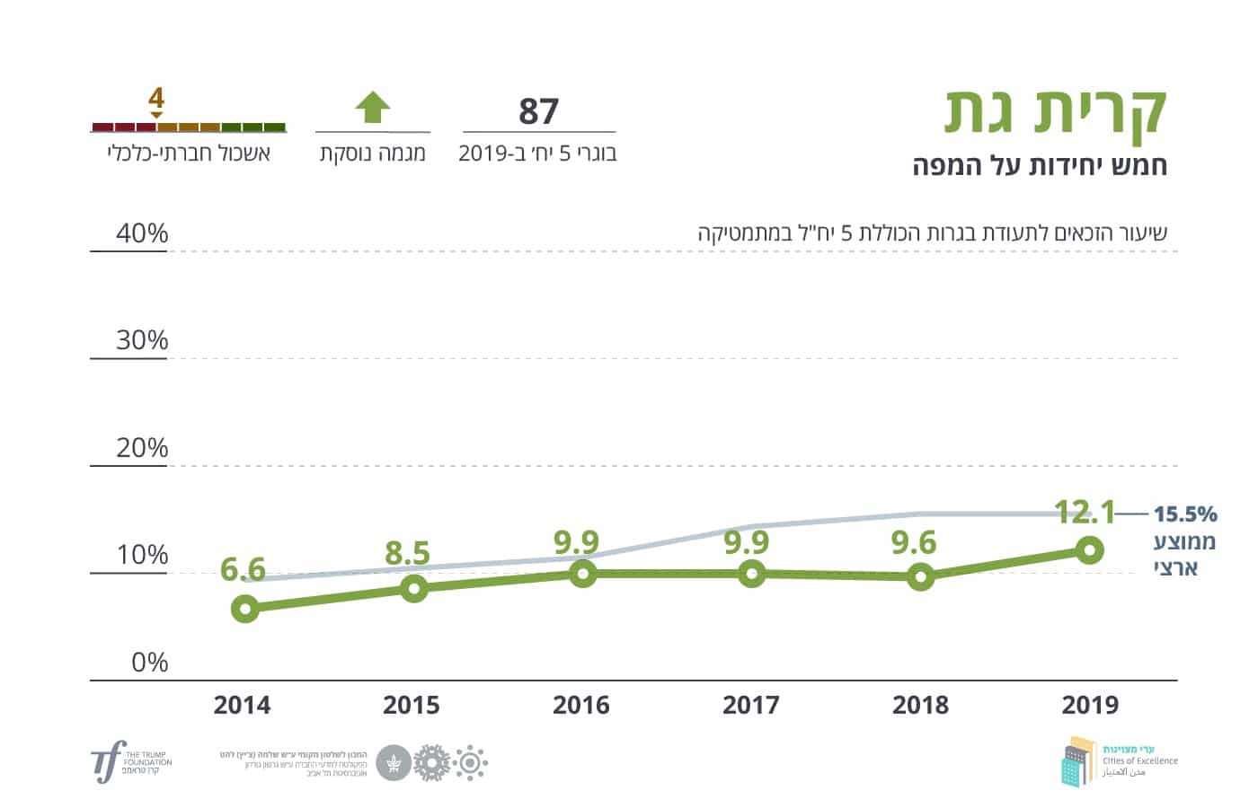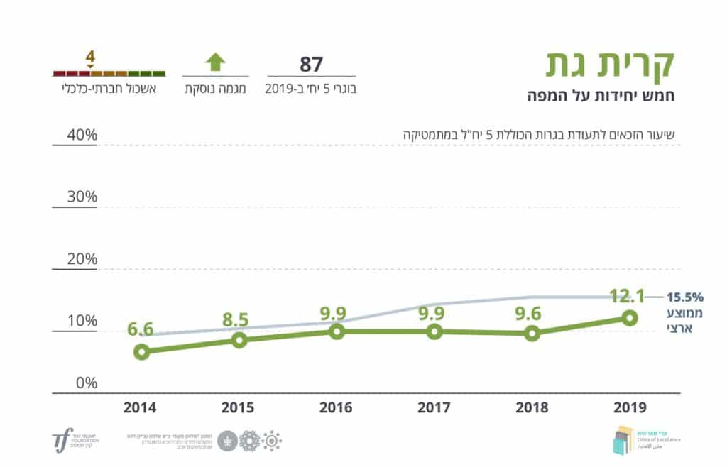 רשת ערי מצוינות, ביזמת קרן טראמפ ובהובלת המכון לשלטון מקומי באוניברסיטת ת"א, מפרסמת את דוח המצוינות השנתי שלה, הבוחן את שיעור הזכאים לתעודת בגרות הכוללת חמש יחידות מתמטיקה בשנת הלימודים תשע"ט לעומת חמש השנים שקדמו לה. הדוח מציג את הישגיהן של 110 רשויות מקומיות. מהדוח עולה כי הממוצע הארצי של שיעור התלמידים הזכאים לתעודת בגרות הכוללת חמש יחידות מתמטיקה נותר 15.5%. מבחינת הדוח עולה כי בקרית גת ישנה עליה של 26% ביחס לשנת תשע"ח