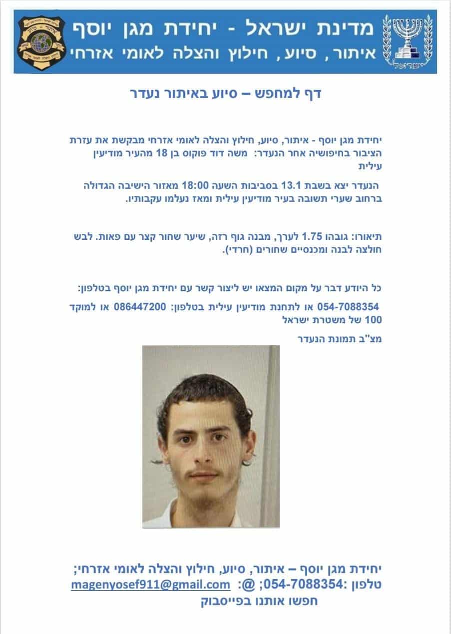 תושב מודיעין עילית העונה לשם משה דוד פוקס, נראה לאחרונה ביום שבת בעיר, ומאז אבדו עקבותיו.