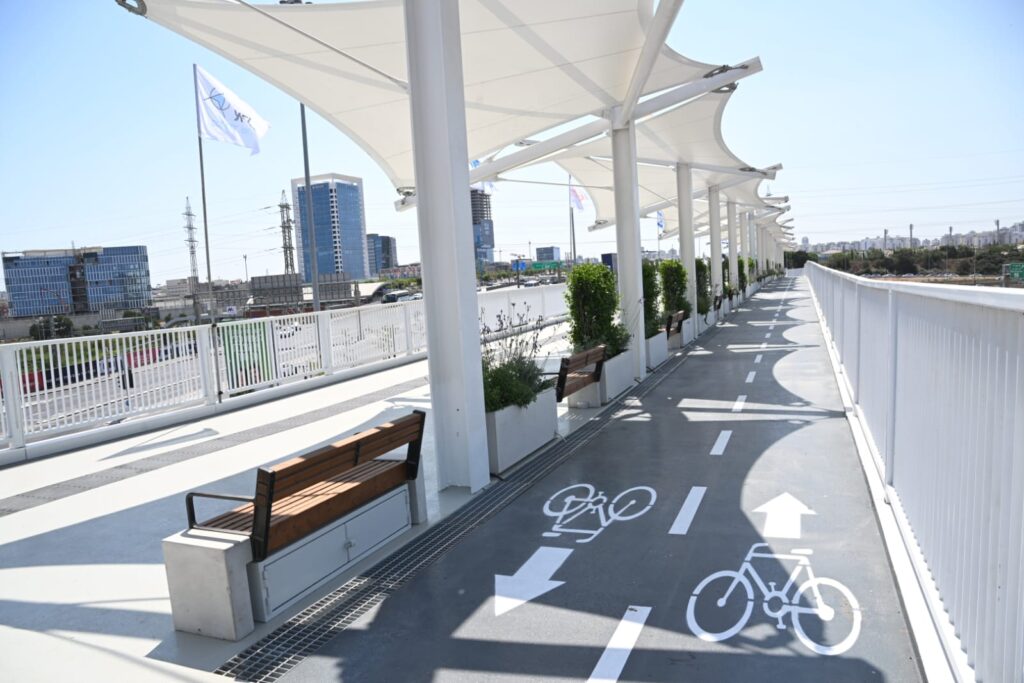 הגשר החדש עובר מעל לכביש 20, והינו אחד מגשרי הולכי הרגל הארוכים ביותר בישראל שמגיע לאורך של 340 מטרים ולרוחב של תשעה מטרים. על גבי הגשר, שמוביל מתחנת הרכבת ראשון לציון משה דיין אל מתחם העסקים החדש בעיר, שולבו שבילי אופניים ברוחב של שלושה מטרים, פרגולות הצללה, ספסלים ופינות ישיבה.