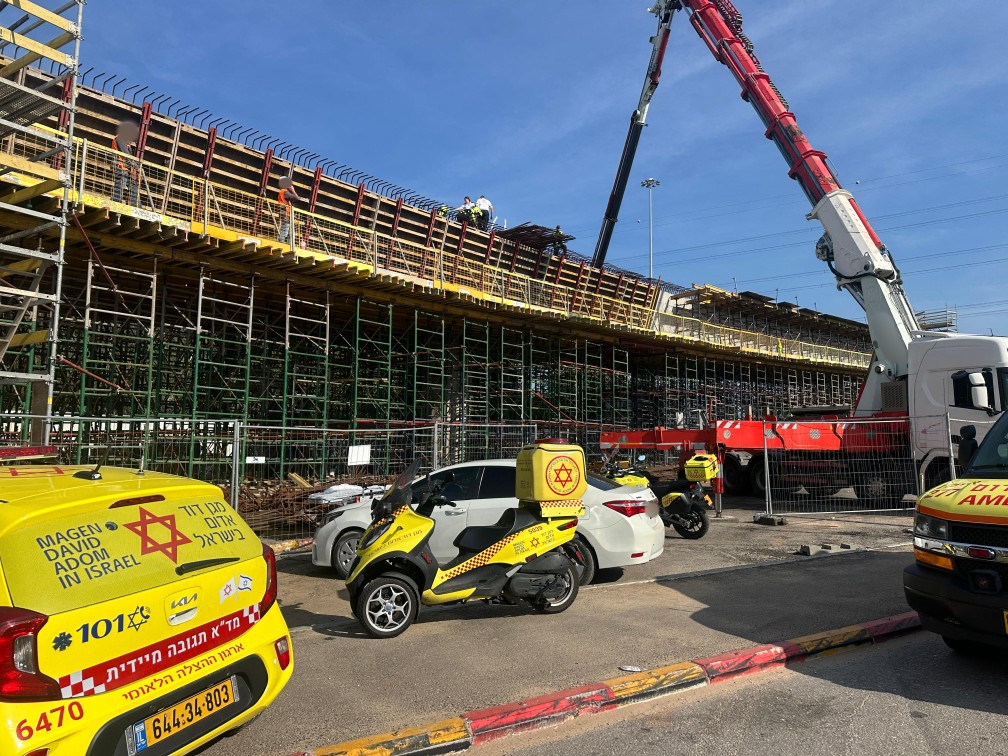 מד"א: בשעה 13:29 התקבל דיווח במוקד 101 של מד"א במרחב דן על פועל שנפצע באתר בנייה ברחוב אלוף שדה ברמת גן. חובשים ופראמדיקים של מד"א מעניקים במקום טיפול רפואי לגבר כבן 30 במצב בינוני עד קשה עם חבלות בפלג גופו העליון.