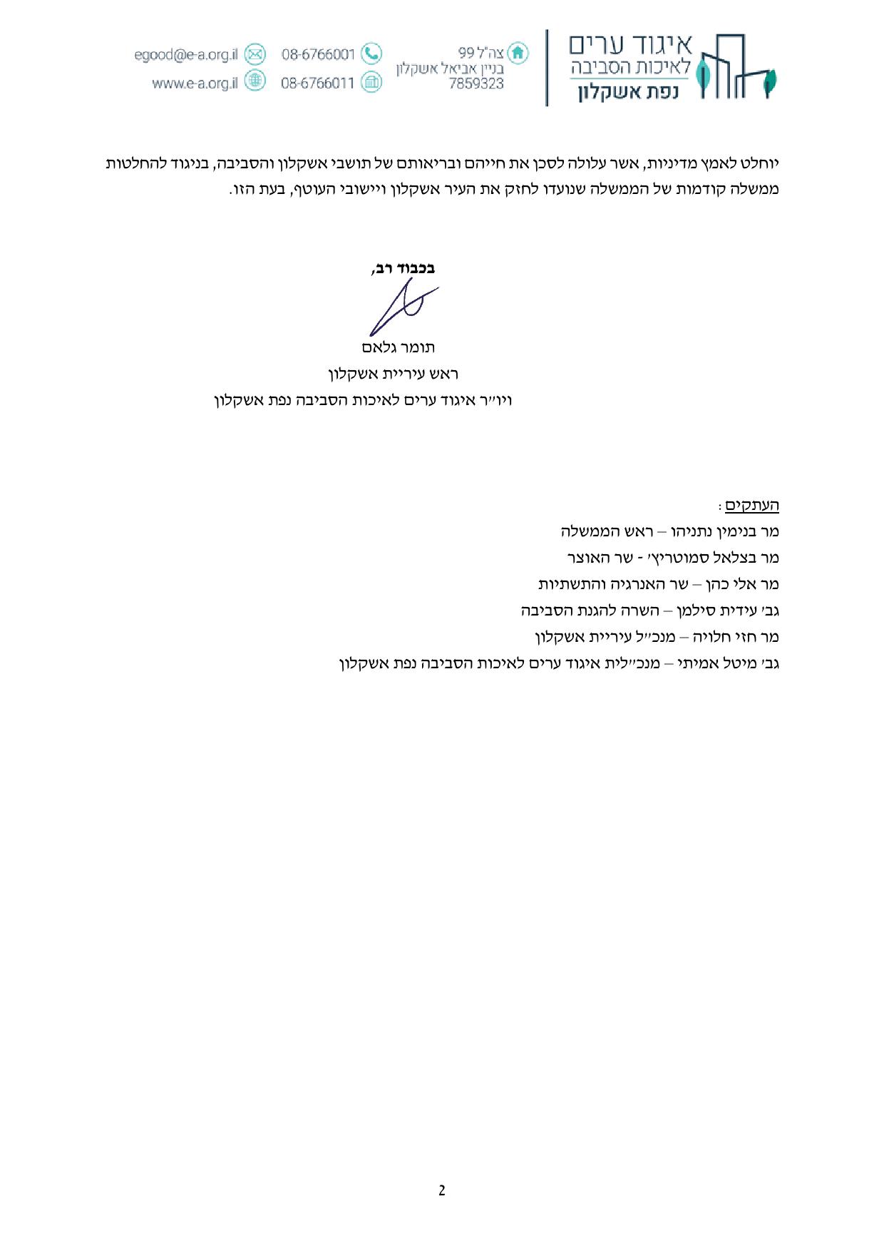 ראש העיר ויו"ר איגוד ערים לאיכות הסביבה נפת אשקלון, תומר גלאם במכתב למנכ״ל משרד ראש הממשלה: