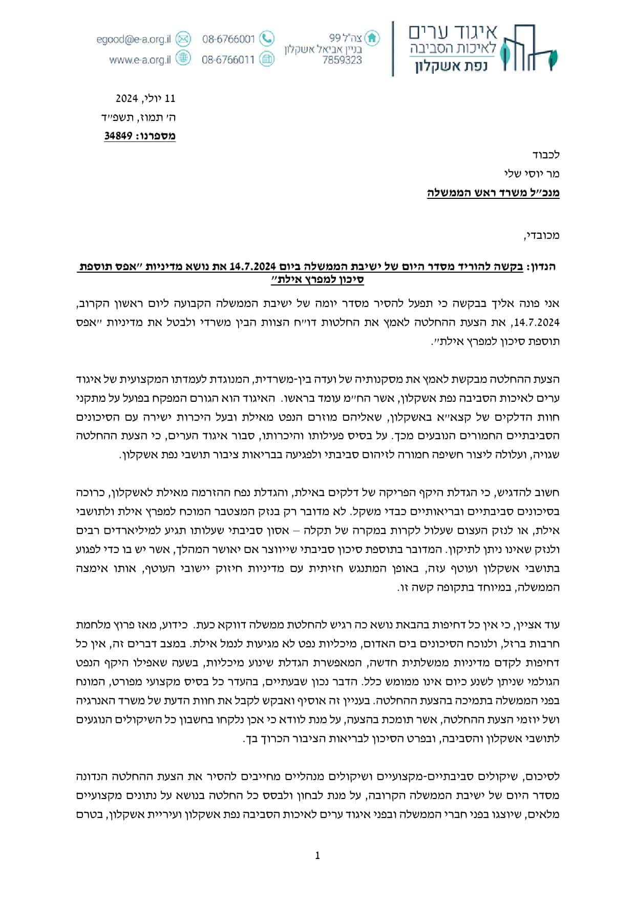 ״חשוב להדגיש, כי הגדלת היקף הפריקה של דלקים באילת, והגדלת נפח ההזרמה מאילת לאשקלון, כרוכה בסיכונים סביבתיים ובריאותיים כבדי משקל. לא מדובר רק בנזק המצטבר המוכח למפרץ אילת ולתושבי אילת, או לנזק העצום שעלול לקרות במקרה של תקלה – אסון סביבתי שעלותו תגיע למיליארדים רבים ולנזק שאינו ניתן לתיקון. המדובר בתוספת סיכון סביבתי שייווצר אם יאושר המהלך, אשר יש בו כדי לפגוע בתושבי אשקלון ועוטף עזה, באופן המתנגש חזיתית עם מדיניות חיזוק יישובי העוטף, אותו אימצה הממשלה, במיוחד בתקופה קשה זו.