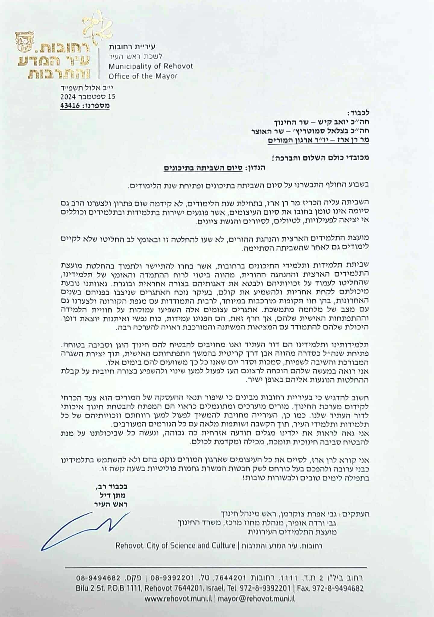 ראש העיר הדגיש במכתבו את מחויבות העירייה להמשיך ולפעול למען רווחתם וזכויותיהם של כל תלמידות ותלמידי העיר, תוך הקשבה ושותפות מלאה עם כל הגורמים המעורבים.