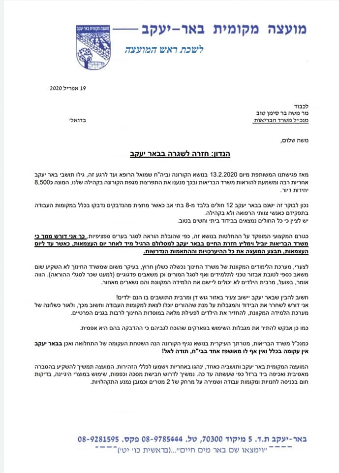 הבוקר (ראשון), ראש מועצת באר יעקב, ניסים כחלון, שיגר מכתב למנכ"ל משרד הבריאות ובו דרש להחזיר את מערכת החינוך בבאר יעקב לפעול כסדרה כבר לאחר יום העצמאות.