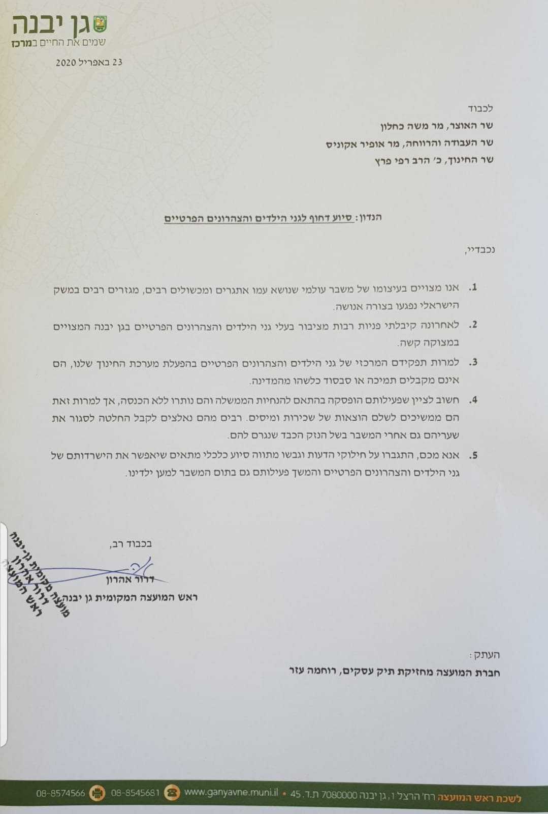 כחלק מהמאמץ של ראש מועצת גן יבנה, דרור אהרון לפתור את מצוקת ההורים בגני הילדים, נשלח מכתב לשרי העבודה והרווחה, החינוך והאוצר במטרה לגבש מתווה סיוע לגני הילדים והצהרונים הפרטיים.