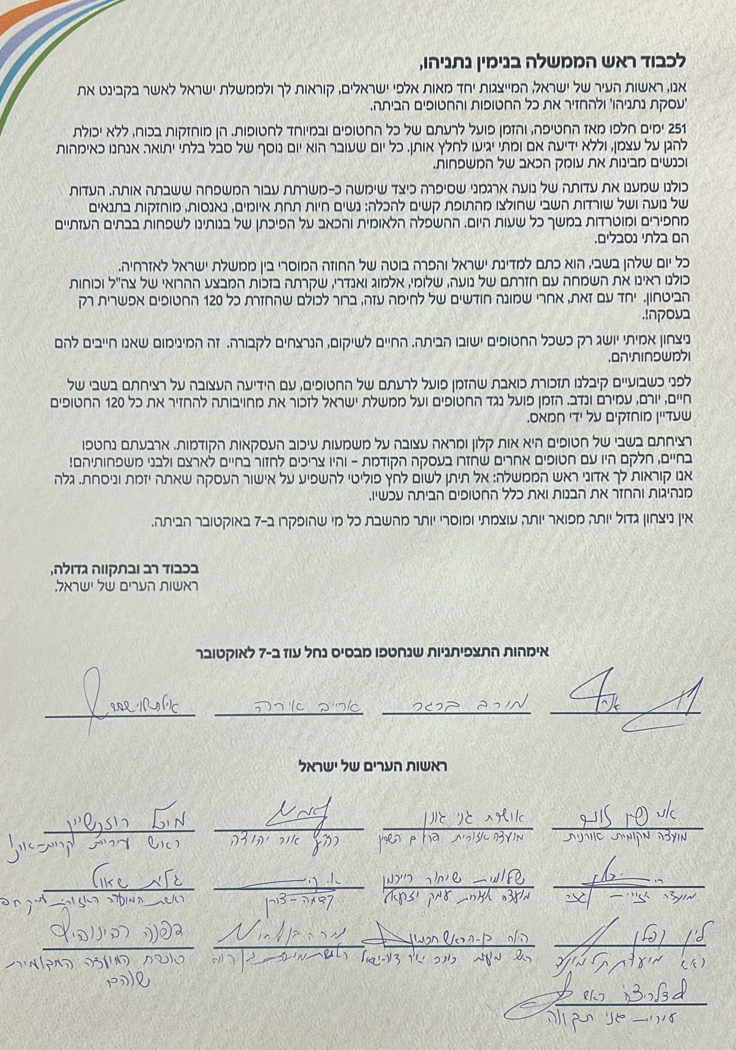 אימהות החטופים ערכו הצהרה מיוחדת עם ראשות הערים של ישראל שבה יצאו בקריאה משותפת אל ממשלת ישראל: "אשרו את עסקת נתניהו והשיבו את כל החטופים הביתה – החיים לשיקום והנרצחים לקבורה״