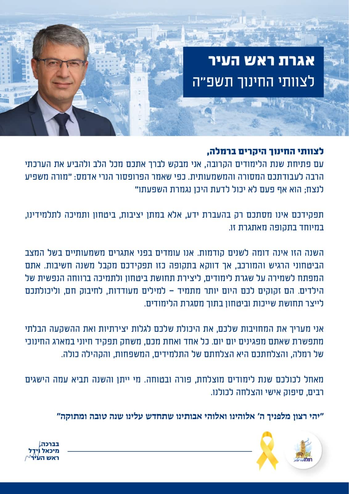 לרגל פתיחת שנת הלימודים, ראש העיר רמלה מיכאל וידל שיגר אגרת מיוחדת לכל צוותי החינוך.