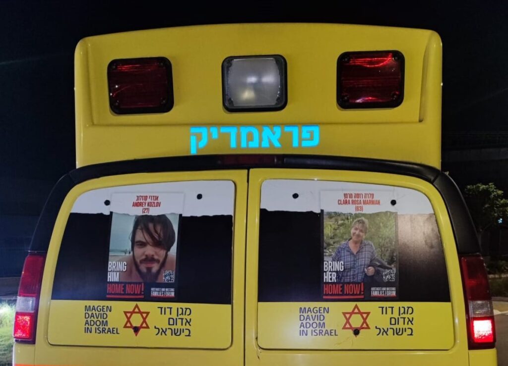 כאות הזדהות עם כאבם של משפחות החטופים החליטה הנהלת מגן דוד אדום כי על שמשות החלונות האחוריים של כל האמבולנסים והניידות לטיפול נמרץ ברחבי הארץ יודבקו תמונות עם פני ושמות החטופים המוחזקים בעזה.