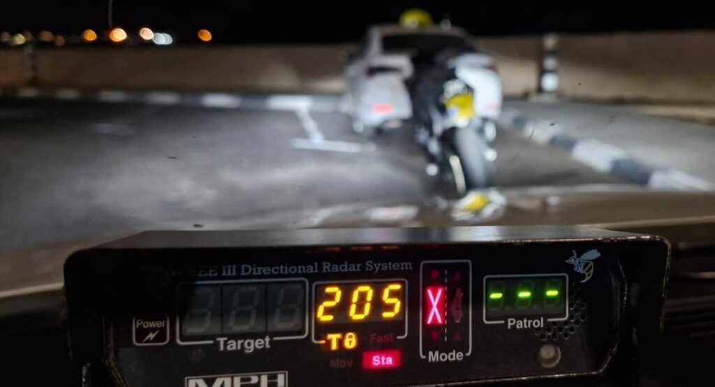 שוטרי משטרת תנועה ארצית בגזרת אילת שעסקו בפעילות אכיפה יזומה נגד עבירות מסכנות חיים קלטו במכשיר למדידת מהירות, רוכב אופנוע הנע במהירות מופרזת של 205 קמ"ש בכביש 90 סמוך לבאר אורה.