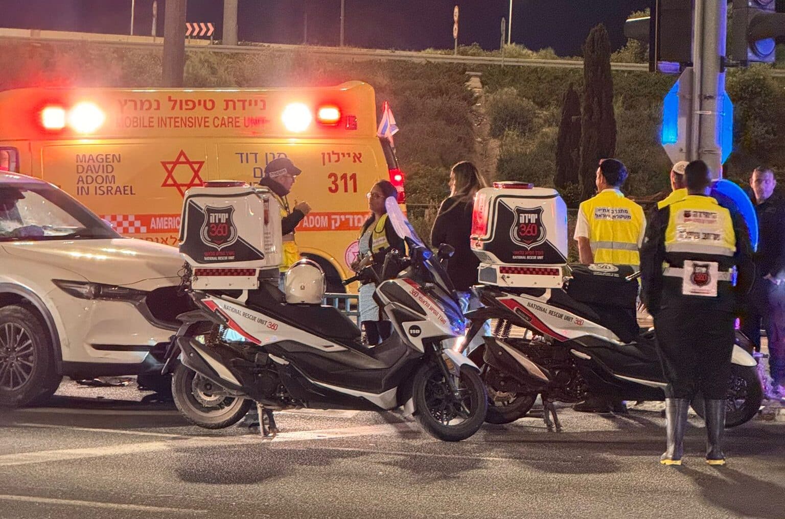 "מדובר בזירת תאונה קשה מאוד, למרבה הצער לא היה ניתן לסייע רפואית לרוכב האופנוע שנהרג במקום. הענקנו סיוע רפואי ראשוני לנהגת הרכב הפרטי ובתה שפונו לאחר מכן באמבולנס לבית החולים להמשך בדיקה וטיפול".