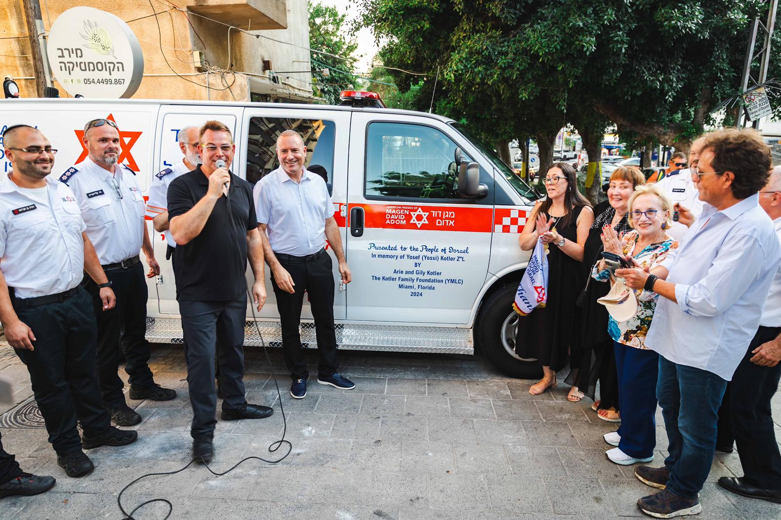 הטקס המרגש נערך במעמד סמנכ"ל קהילה במד"א פרופ' אלי יפה, ראש עיריית רחובות מתן דיל, חברי מועצת העיר, הנהלת מד"א, אמו ואחותו של אריה יונית קוטלר וחברי המשפחה. במהלך הטקס אמו של אריה, חיה קוטלר נשאה דברים בשם המשפחה, "אני נרגשת לעמוד כאן הערב, בטקס כל כך משמעותי. למרות שאריה שוהה כרגע בחו"ל, ליבו עם הארץ והוא נרגש ופועל ללא הרף למען עם ישראל וארץ מולדתו. זאת לא סתם תרומה זו מתנה של חיים. האמבולנס הזה ישרת את תושבי רחובות והסביבה ויסייע להגיע בדיוק ברגעים שבהם כל שנייה קובעת. תודה ענקית למגן דוד אדום, לצוותים שפועלים יום ולילה ללא הפסקה ובמסירות אינסופית. אתם ההשראה האמתית". עוד הוסיף ונשא דברים גם חבר מועצת העיר רחובות אבי קינד שהוא גם חברו הטוב של אריה קוטלר, "בכל חג, אריה מבקש ממני לעבוד בעבור הנזקקים, החלשים בחברה, ניצולי השואה ועוד. בראש מעיניו, שאף אחד לא יישאר רעב בחג. גם במלחמה, לגדוד של בני היו חסרות קסדות ואריה מבלי להסס רכש עבורם קסדות טקטיות יקרות. הוא ההוכחה שאפשר להיות בעל לב רחב, ציוני וערכי".