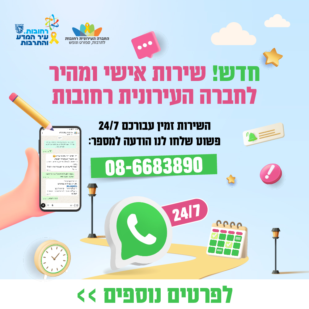 חדש ברחובות: החל מהשבוע יכולים תושבות ותושבי העיר ליהנות משירות וואטסאפ חדש של החברה העירונית, המאפשר לקבל מענה אישי, מהיר ונגיש במגוון תחומים – בלחיצת כפתור, ישירות מהנייד.