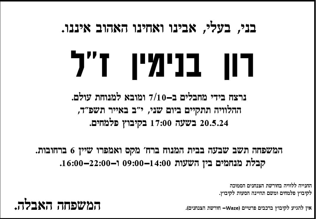 הלוויה תתקיים מחר, יום שני, י"ב באייר תשפ"ד, 20.5.24 בשעה 17:00 בקיבוץ פלמחים. ניתן לחנות את הרכבים בחורשת הצנחנים הסמוכה לקיבוץ ומשם יהיו הסעות לקיבוץ. לא ניתן להיכנס לקיבוץ ברכבים פרטיים.