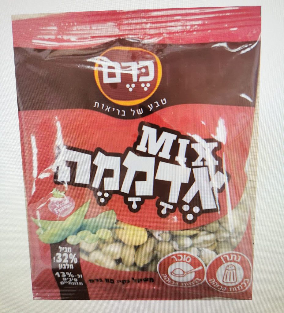 המוצר: תערובת פולי סויה קלויים, בציפוי צ'ילי, שום וואסבי ומלח, שם מסחרי: "אדממה MIX", משווק: "כרם" טבע של בריאות. תכולה: 80 ג'