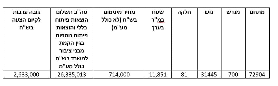 בנוסף לסכום שיוצע עבור הקרקע ישלם הזוכה במכרז הוצאות פיתוח למשרד ואגרות והיטלים ודמי הקמה לרשות המקומית, הכל כמפורט בחוברת המכרז.