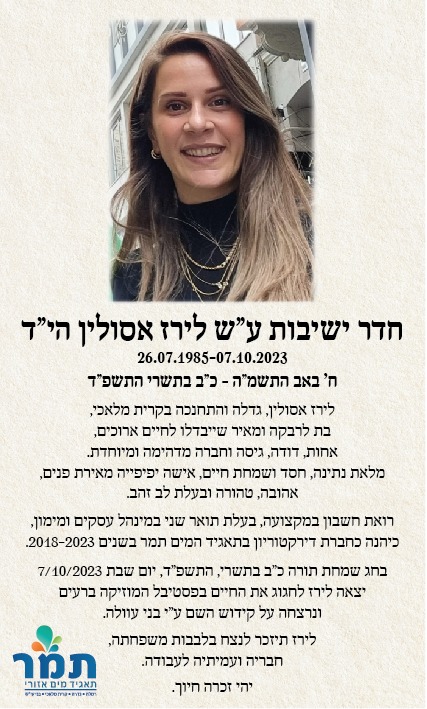 בשבת השחורה, ה-7 באוקטובר, נרצחה לירז אסולין הי"ד בטבח ברעים. לירז, בת 37 שנים במותה, הייתה חברת דירקטוריון בתאגיד המים תמר.