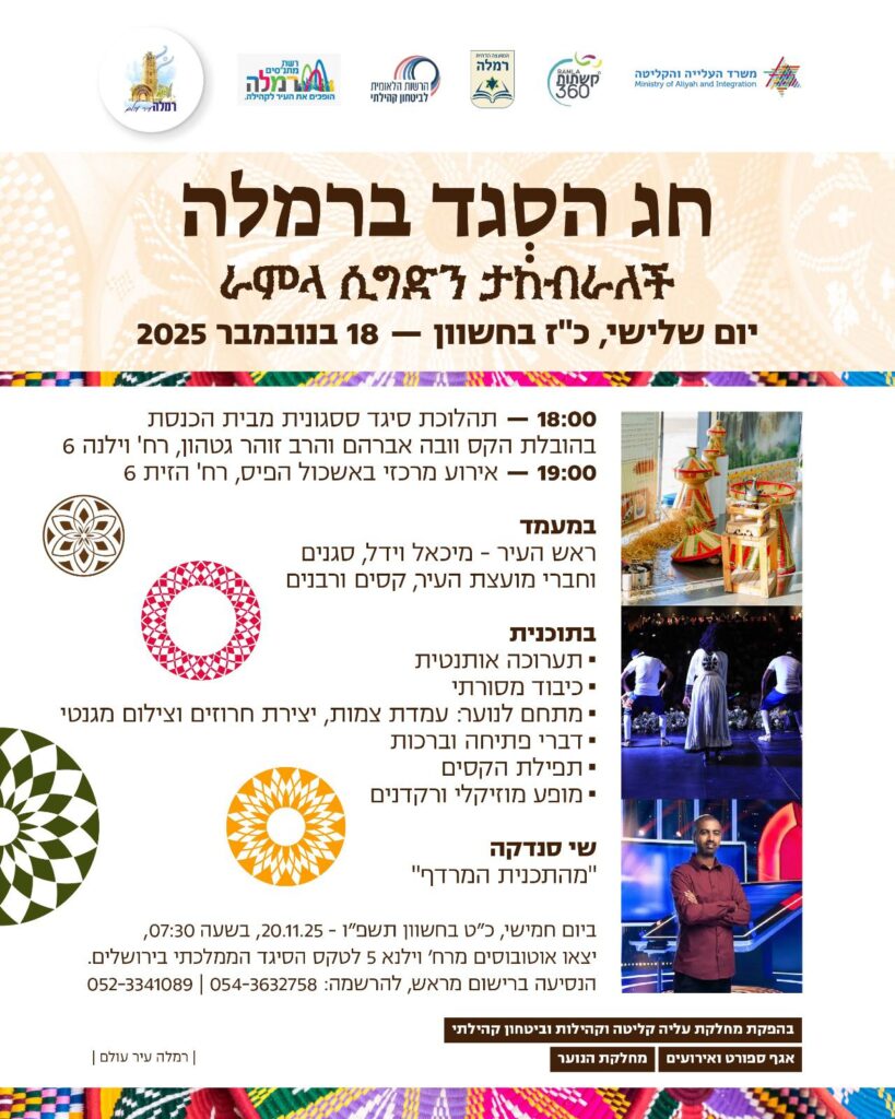 עיריית רמלה מזמינה את הציבור לחגוג את חג הסגד ביום שלישי, ה-18.11.25, באשכול הפיס בעיר. האירוע יכלול תהלוכה ססגונית מבית הכנסת ברחוב וילנה 6, בהשתתפות הקס וובה אברהם והרב זוהר גטהון, לצד רכב תהלוכה ומוזיקה חיה.