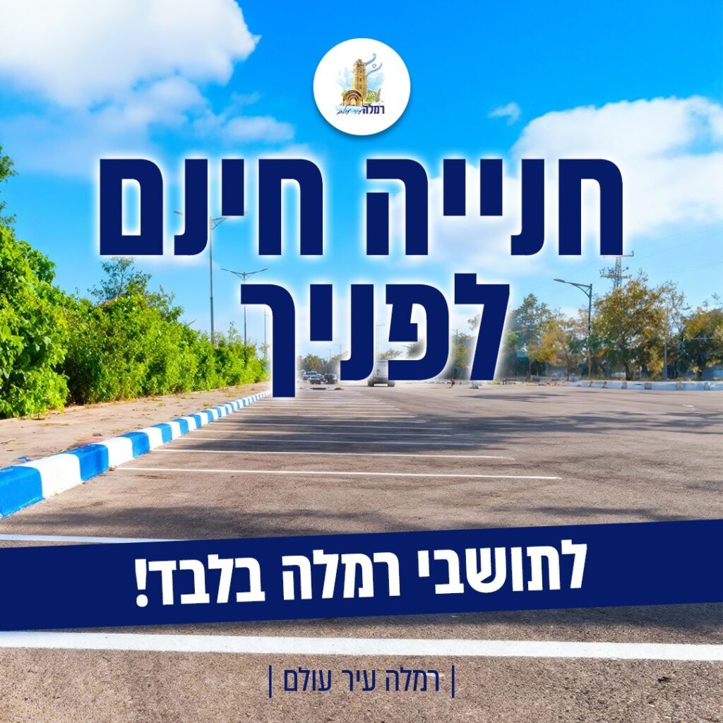 לאחר שהשטח הוסדר ונבדק הנושא המשפטי, קיבלנו החלטה ברורה: תושבי רמלה יחנו בחינם וללא הגבלת שעות – באמצעות רישום רכב בבעלות תושב רמלה. תושבים שטרם רשמו את רכבם מוזמנים לעשות זאת בקישור הבא: https://did.li/c68aa