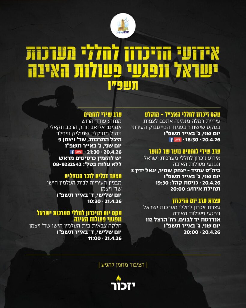 בעיר רמלה יתקיימו מחר ומחרתיים אירועי יום הזיכרון לחללי מערכות ישראל ולנפגעי פעולות האיבה, תשפ״ו, שיכללו טקסים ממלכתיים, עצרות זיכרון ומופעי שירה קהילתיים – כולם בסימן התייחדות, כבוד והנצחה.