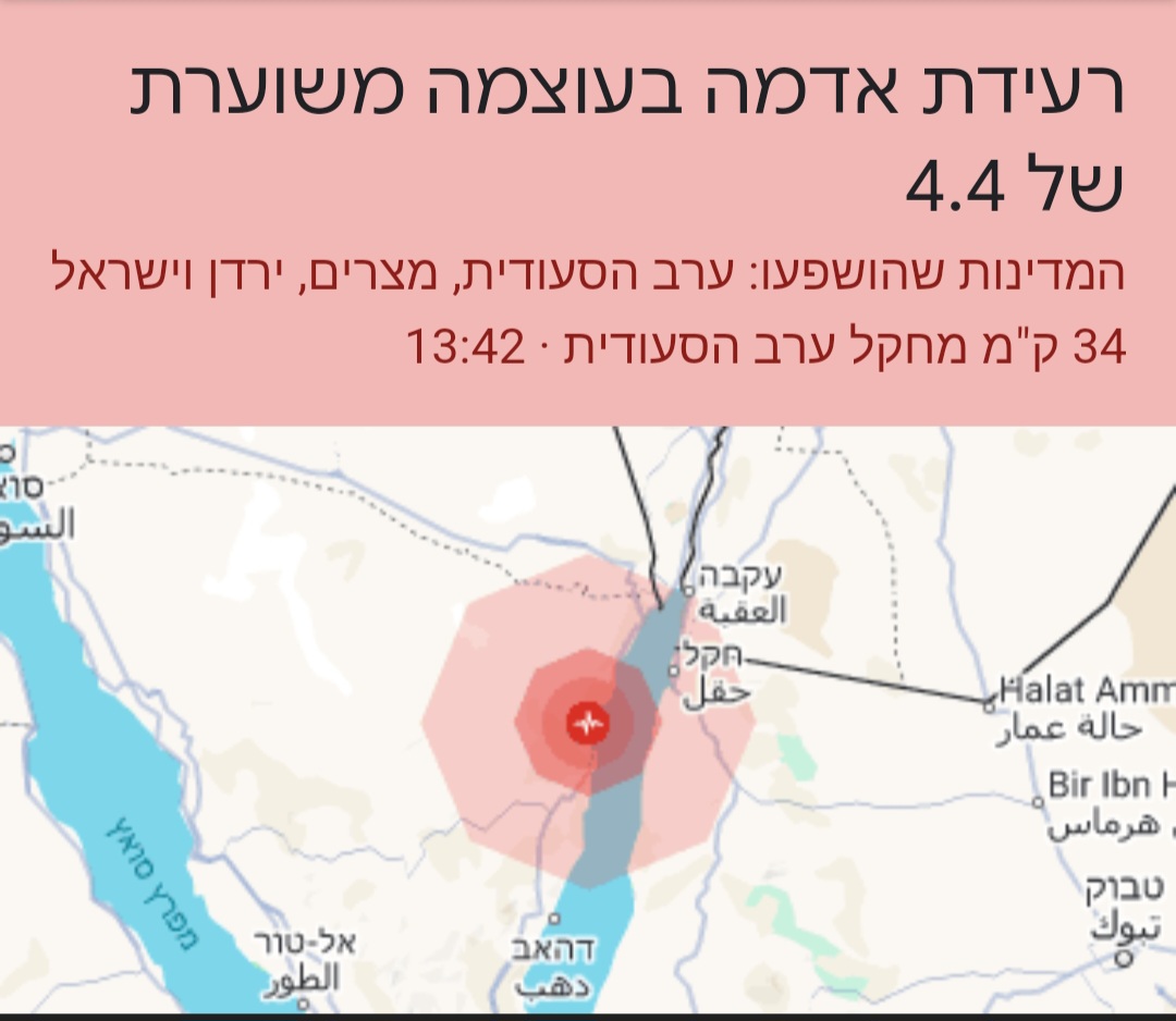על פי מערכת גוגל העולמית התרחשה רעידת אדמה באזור ערב הסעודית בעוצמה משוערת של 4.4 כאשר המדינות הנוספות שהושפעו הן מצרים, ירדן וישראל.