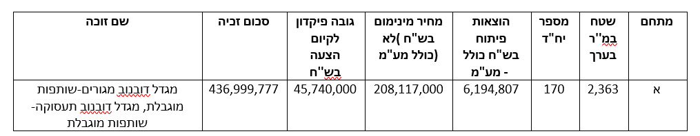 המגרש ששווק במכרז מיועד לשימוש עירוני מעורב למגורים, מסחר, תעסוקה, מוסדות ומבני ציבור ומלונאות כחלק מתוכנית 'דובנוב 4-6'
