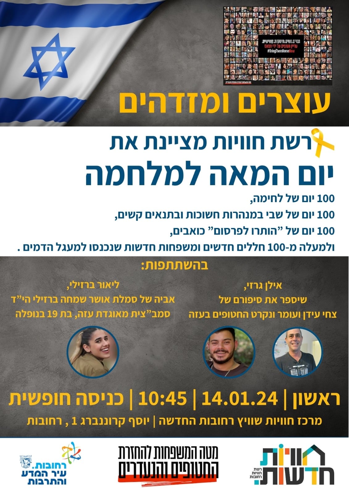 רשת חוויות רחובות מציינת את יום ה- 100 לטבח ולחטיפות שבת השחורה, ה-7.10 ופרוץ המלחמה, בהתכנסות קהילתית, בהשתתפות ליאור ברזילי, אביה של סמלת אושר שמחה ברזילי הי"ד.