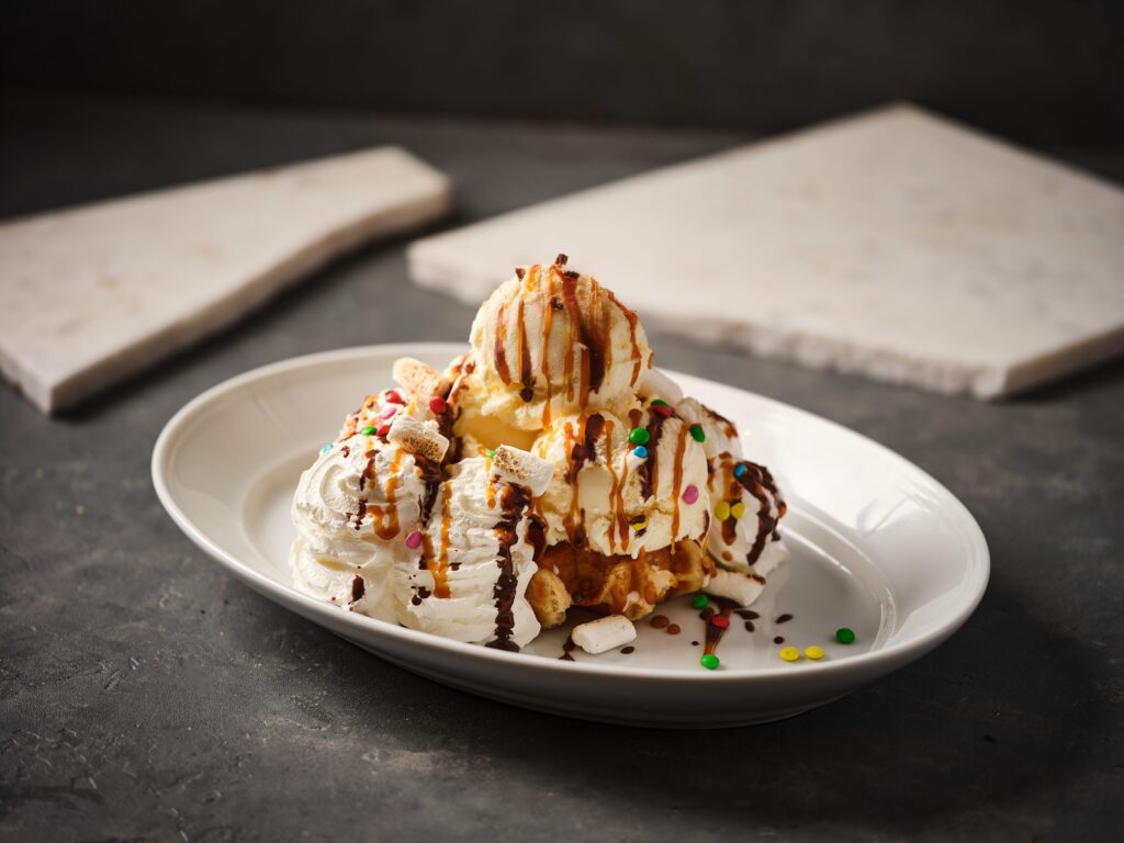 אקסטרים! – וופל עם שני כדורי גלידה בטעם וניל, כדור גלידה בטעם שוקולד, רוטב נוצ'יטלה, רוטב קרמל מלוח, מיני מרשמלו, סוכריות עדשים צבעוניות וקצפת עשירה.