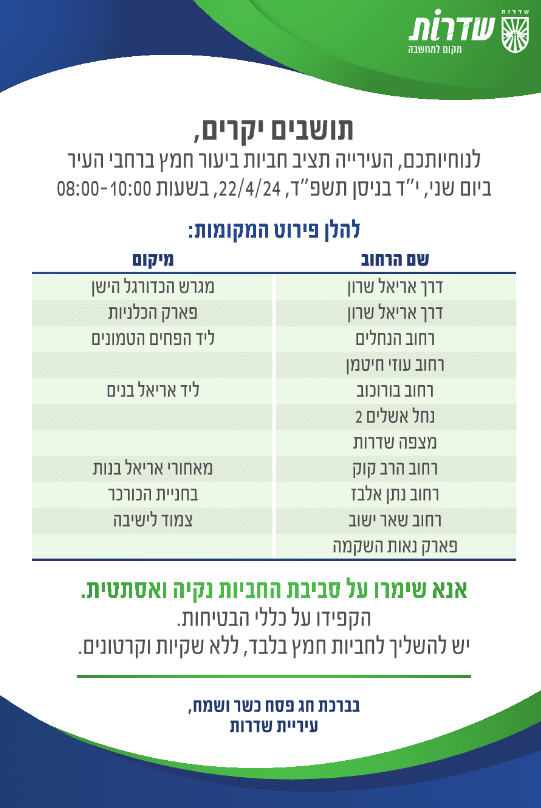 לקראת חג הפסח, עיריית שדרות תציב חביות ביעור חמץ ברחבי העיר, ביום שני, י״ד בניסן תשפ״ד, 22/4/24, בשעות 08:00-10:00.