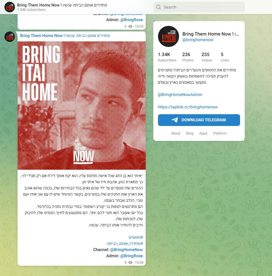 ערוץ טלגרם בשם ״BringHomeNow״- המטמיע עצמו בפעילות אותנטית ברשת תחת שמות והאשטגים דומים ומטרתו העיקרית איסוף פרטי ישראלים באמצעות הפנייה לטופס "התנדבות" ומילוי פרטים אישיים.