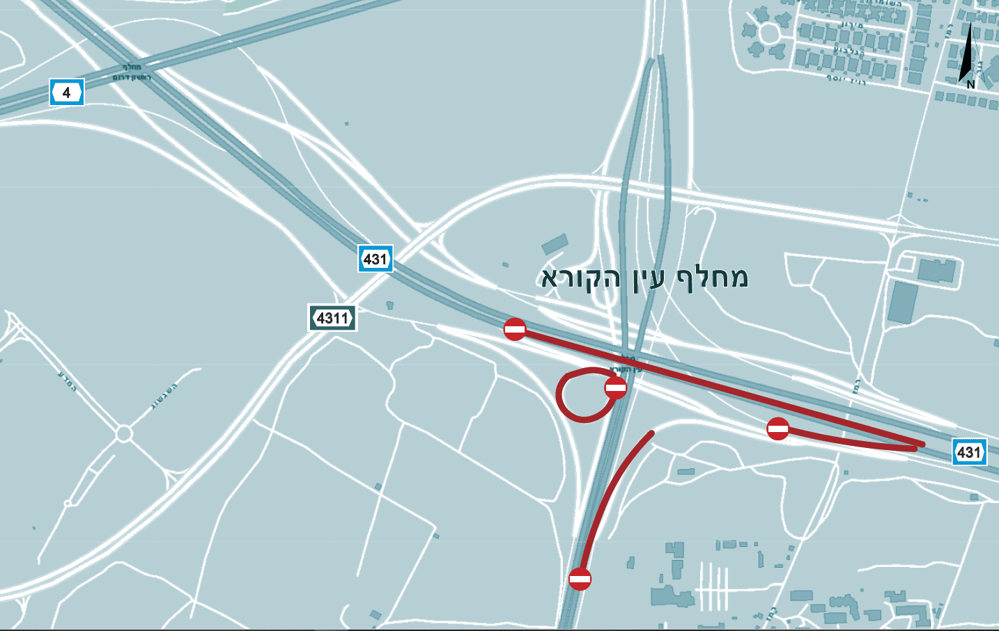 בליל יום חמישי, 27/10/2022 החל מהשעה 21:00 ועד לשעה 09:00 בבוקר שלמחרת, ייחסם לתנועה כביש 431  בין מחלף עין הקורא למחלף באר יעקב/נס ציונה. רמפת הירידה למחלף עין הקורא לבאים מכביש 4311 לכביש 42 לדרום (יבנה) תיחסם! בנוסף, ייסגר לתנועה מחלף עין הקורא לבאים מכביש 42 לכיוון תל אביב ולירושלים (431 מזרח) ולכביש 42 דרום.
