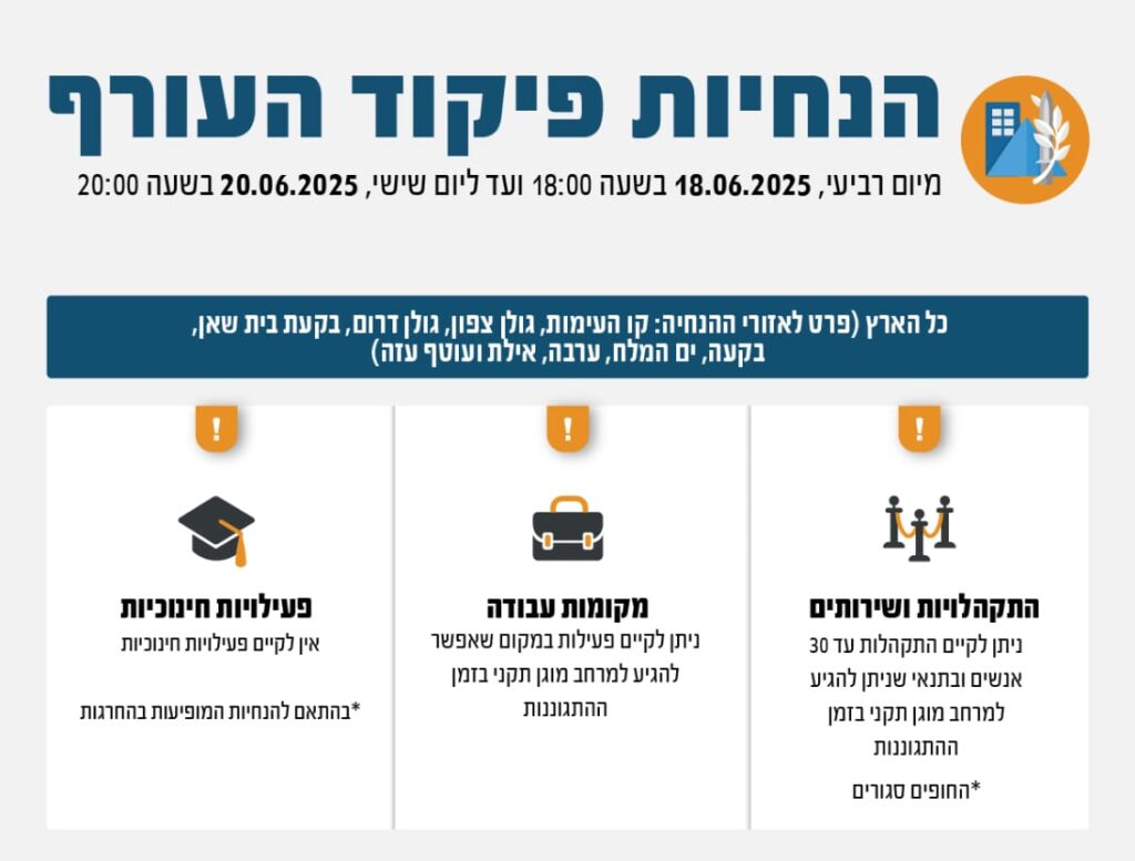 המדיניות בתוקף החל מיום רביעי, 18 ביוני 2025, בשעה 18:00 ועד ליום שישי ה-20 ביוני 2025, בשעה 20:00.