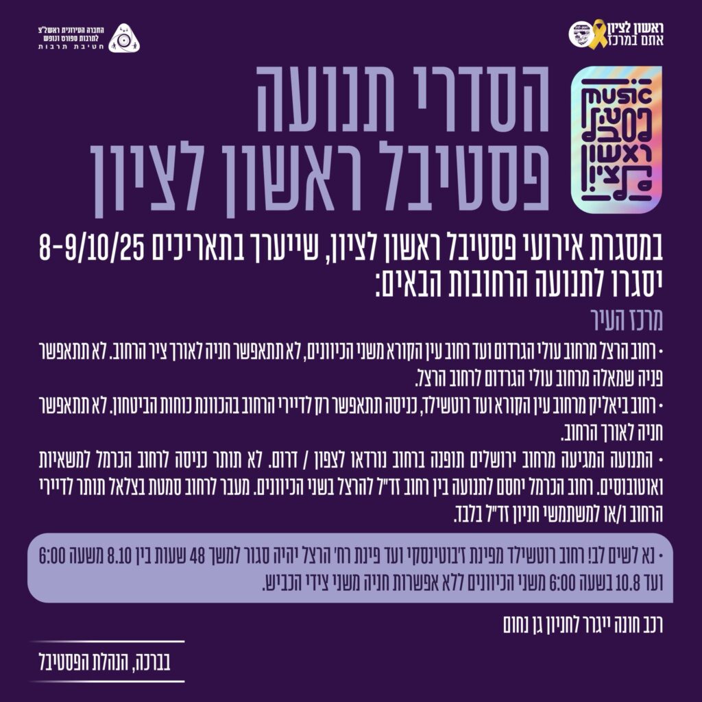 עיריית ראשון לציון נערכת לאלפי המבקרים שיגיעו לעיר לפסטיבל ראשון ה-37. במסגרת ההיערכות, יבוצעו חסימות כבישים והסדרי תנועה מיוחדים