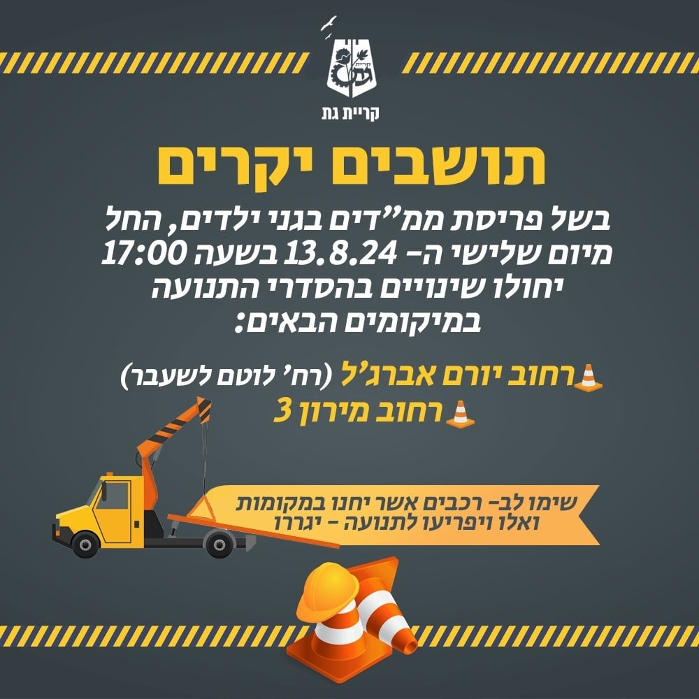 בשל פריסת ממ"דים בגני ילדים ברחבי העיר, החל מיום שלישי ה-13.8.24 בשעה 17:00 יחלו שינויים בהסדרי התנועה ברחבי העיר: