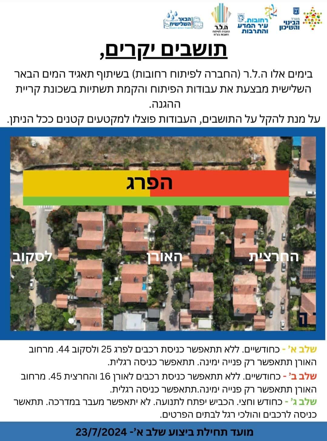 כאמור העבודות יחלו ביום שלישי הקרוב (23.7) ויתקיימו בימים א'-ה' בין השעות 08:00-17:00.