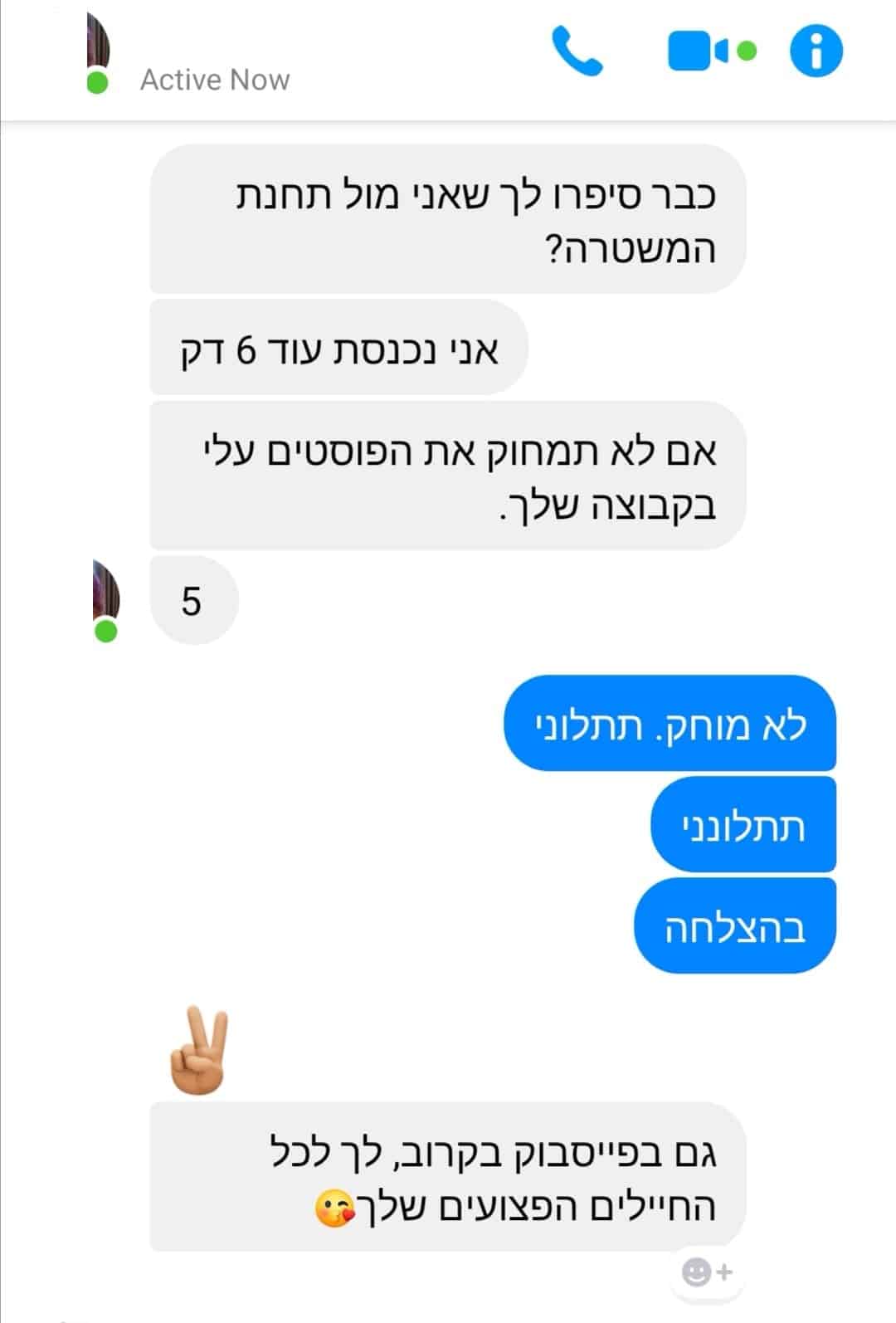 היא אגב פרסמה כך: "אז מה נשמע? אלימות וביריונות בעיר מגיעה לשיאים חדשים, גם מהמשטרה הוא לא מפחד, לא שזה מפתיע. התלוננתי על בריונות רשת, פוסטים שיקריים עלי ועוד דברים שהוא עשה וחשב שזה בסדר גמור להתנהל ככה, כי כנראה עוד לא היה מי שיעצור אותו. כל היוזרים הפיקטיביים שלו וחברים שלו, ממשיכים ב"מילים היפות" וההקנטות למרות שביקשתי שימחק את הפוסטים, כנראה ממש משעמם לו בעבודה ועל זה – אתם משלמים. אגב, רוצים לעזור? מאוד פשוט להתלונן בפייסבוק על החשבונות המזוייפים, זה אחד הדברים הקלים והמועילים נגד בריונות רשת. אשמח אם תעשו זאת למען הקבוצה והעיר. מסקנות מהיממה האחרונה: יש אנשים שמכניסים אותך בכוח לסרט שהם חיים בו – אז לפחות תהיי דמות ראשית".