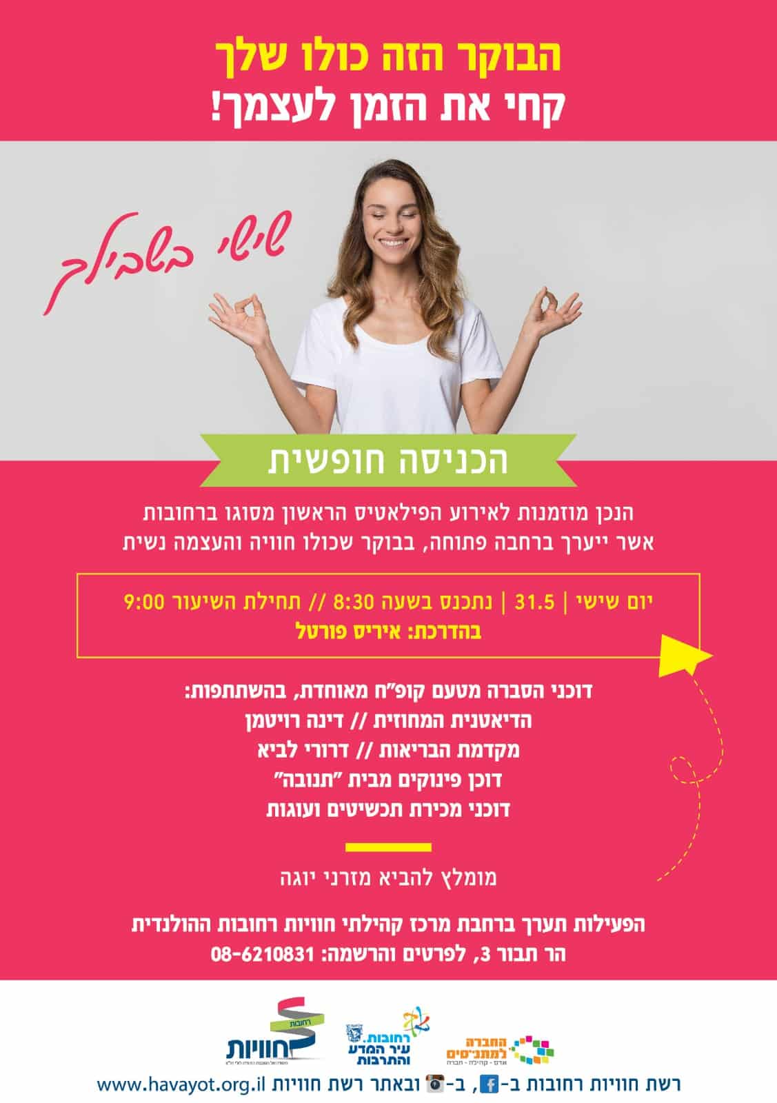 נשים יקרות, פנו לכן את שישי הקרוב – 31.5, בשעה 8:30 – והגיעו אל רחבת מרכז קהילתי רחובות ההולנדית שם יתקיים אירוע פילאטיס המוני לנשים – והכניסה חופשית!!!