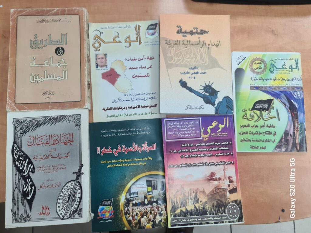 בתמונה ספרים עם אידיאולוגיית דאעש שנתפסו ברשות אחד החשודים.