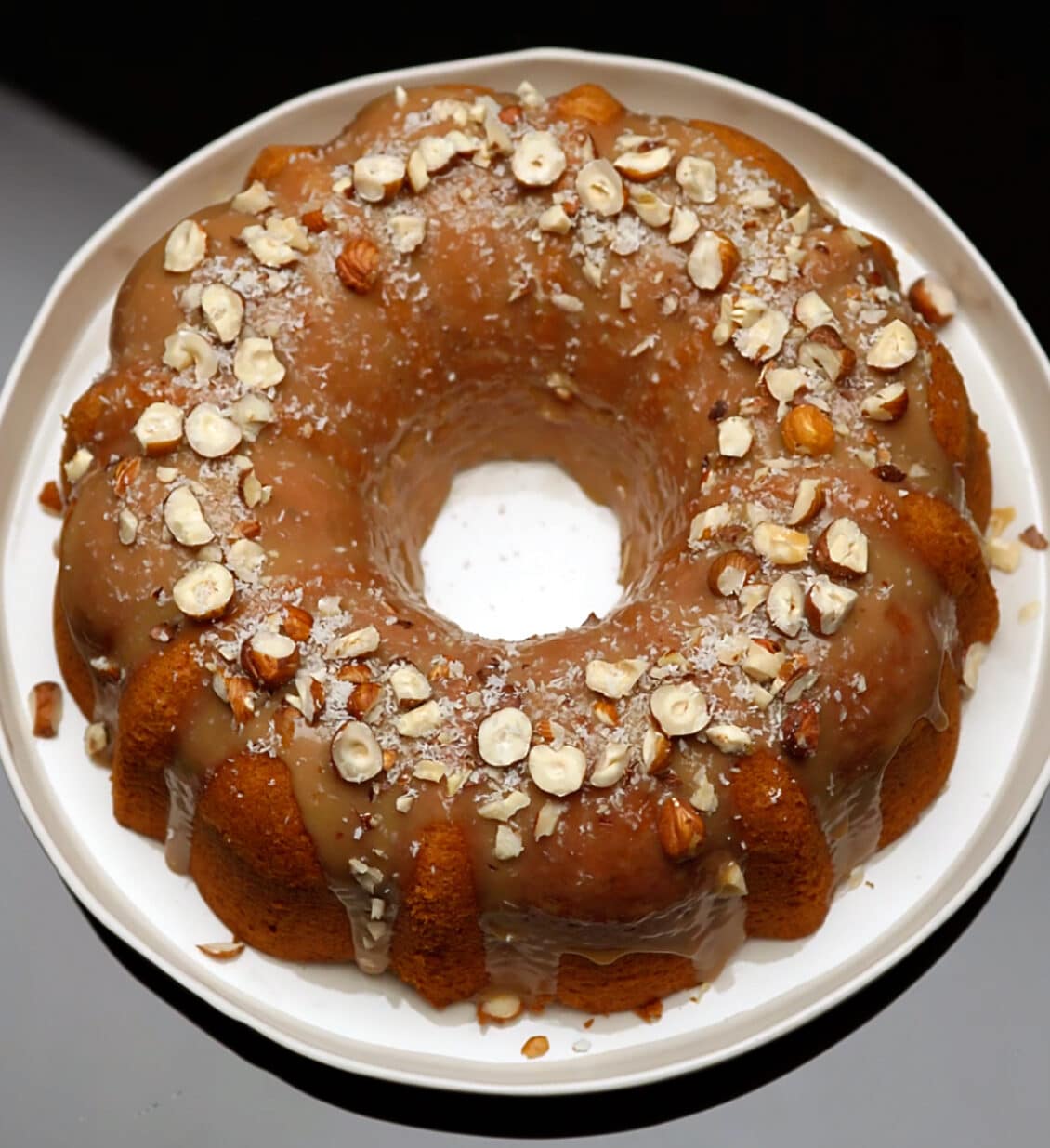 כשהעוגה מתקררת מחלצים מהתבנית ומקשטים בקרם אגוזי לוז, אגוזי לוז מרוסקים ומעט קוקוס טחון.