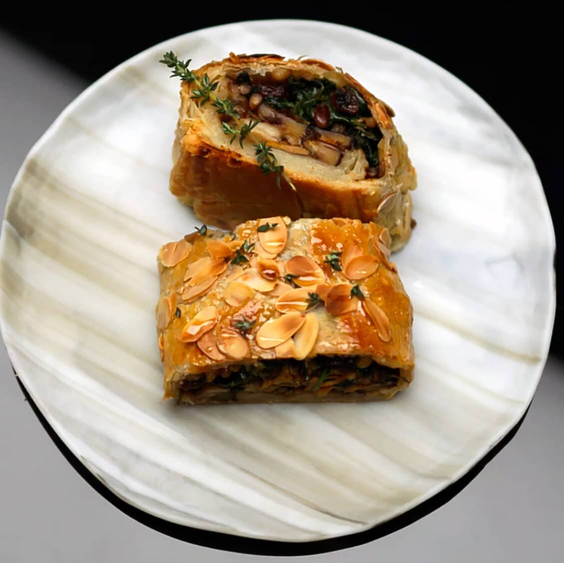 טורפים ביצה ומברישים את בצק העלים. אופים ב-165 מעלות למשך 40 דקות. לפני ההגשה מזגגים במעט דבש ומקשטים בענפוני תימין טרי.