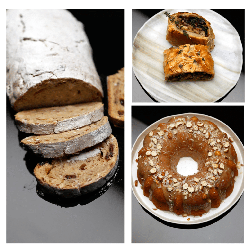 שלושה מתכונים משביעים וטעימים, מכילים מגוון אגוזים: שטולן שקדים ופירות, שטרודל פטריות וערמונים ועוגת אגוזי לוז.