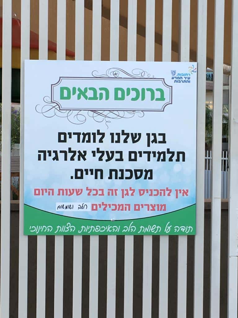 יוזמה חשובה וסופר מתחשבת מתקיימת באמצעות המחלקה לגיל הרך באגף החינוך והנוער בעיריית רחובות ובמרכזה התקנת שלטים, בכניסה לכל גן בו לומד ילד עם אלרגיה מסכנת חיים.