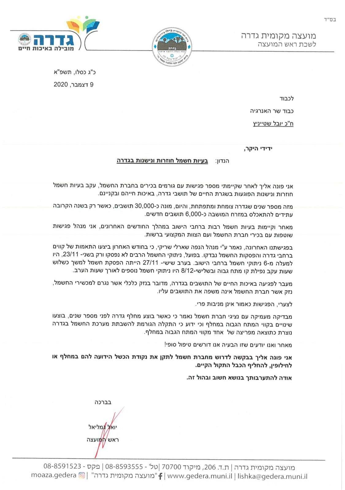 יואל גמליאל: "ירדתי לשורש הבעיה שהטיפול בה יתן מענה לתקלות. לצערי, חברת החשמל אינה פועלת מיידית למתן פתרון ובינתיים התקלות ממשיכות. לאור זאת, פניתי בבקשה בהולה לשר האנרגיה, ח״כ יובל שטייניץ לטיפול בנושא חשוב זה. אעדכן אתכם עם כל התפתחות בנושא".