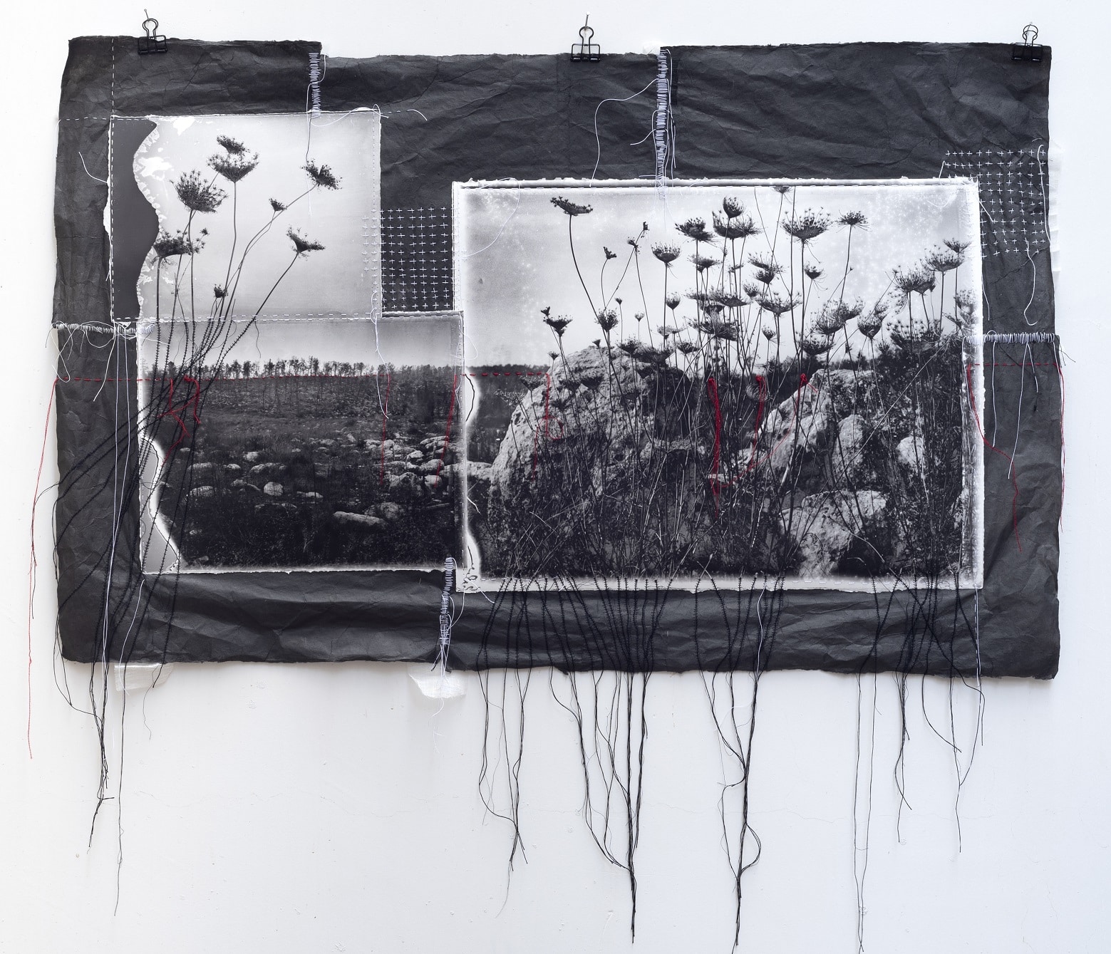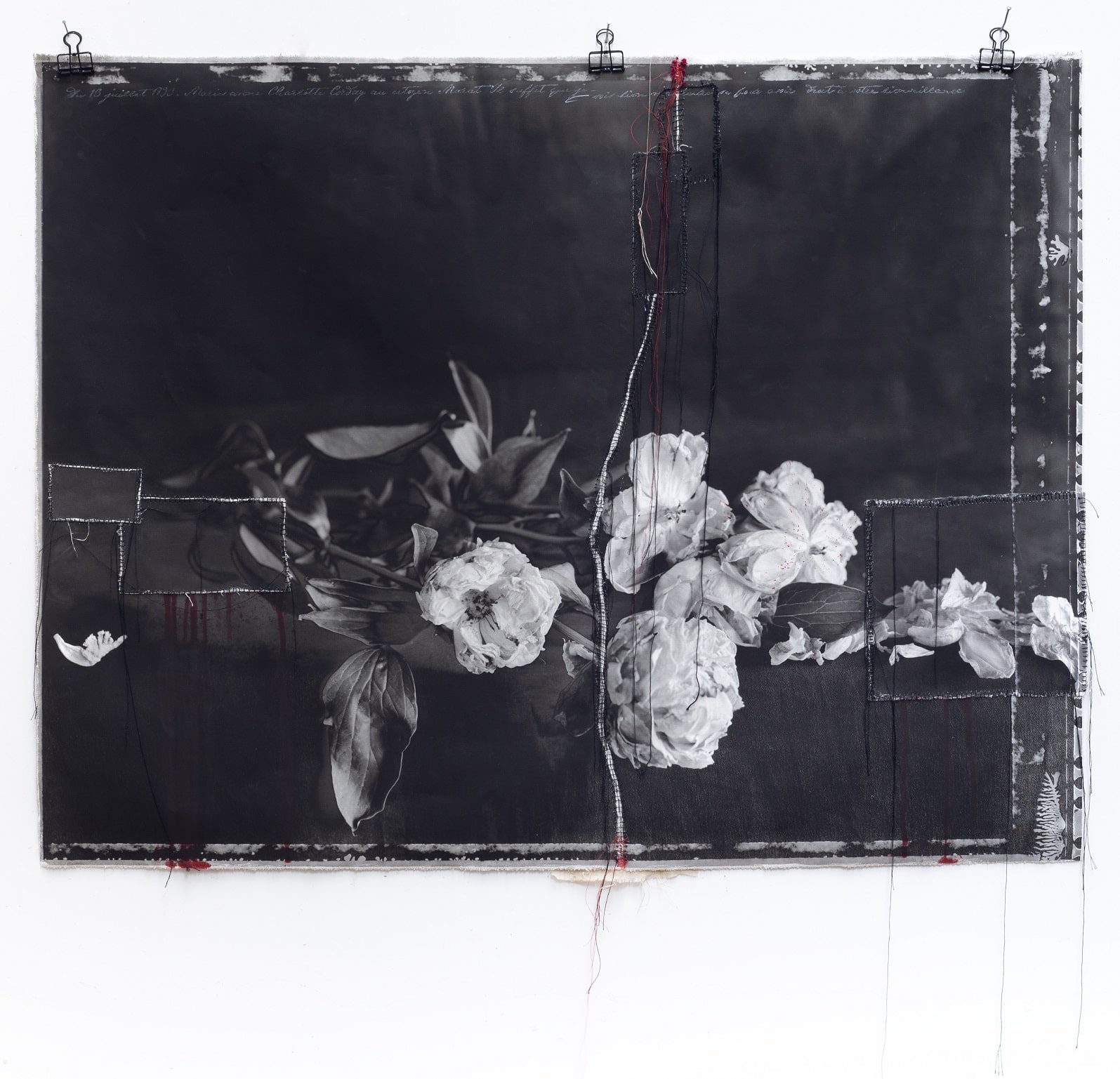 ב-'קרעים וחיבורים וקרעים' עבודות יפהפיות של אנה חייט וסלבה פירסקי שנוצרו במיוחד לתערוכה. צילומים המודפסים על בד, חלקם קרעי צילומים תפורים ביד, ואחדים רקומים בחוטים משתפלים. בדימויים התפורים, המאוחים-מתפרקים, כאב מפעפע מבין התפרים כמו מגוף פצוע. הצילומים נעשו במצלמות בפורמט גדול על סרטי פולרואיד מסוג שייצורו נפסק ב- 2007. החומר הכימי שתוקפו פג מותיר על הדימוי כתמים אקראיים, המרמזים על התפרקות הדימוי העתידית ומסמנים אותה. המראה מזכיר במידה רבה צילום אנלוגי מוקדם, אך הוא גם שונה ממנו. תפירת הצילומים, מהלך חדש, החלה בהשפעת היכרות עם ה"קינצוגי", טכניקה יפנית של ריפוי קרמיקה המדגישה קווי שברים, כלומר משמרת את ההיסטוריה של הכלי ולא מנסה להסתיר פגמים. השימוש בתפירה ורקמה בתוך צילומים יוצר עבודות הנעות בין דו-ממד לתלת-ממד. האמנים עוקבים בחרדה ובדריכות אחר המלחמה המתחוללת באוקראינה המשפיעה ישירות על מהלך חייהם של קרובים וידידים. הטכניקה החדשה של תפירת הצילומים משמשת מבטאות תחושות דחיפות ופגיעות. "בשפה האמנותית שפיתחו חייט ופירסקי מאז החלו לעבוד יחד ב-1999 יש דיאלוג מתמשך בין צילום וציור. העבודה "מות מארה" מ-1793מתייחסת לעבודה La Mort de Marat של ז'אק-לואי דויד, הצייר הנאו-קלאסי הצרפתי,. בציור נראה ז'אן-פול מארה, ממנהיגי המהפכה הצרפתית, שנרצח בעת שהיה באמבטיה בביתו. דויד הקנה לציור שפה איקונוגרפית נוצרית (בעיקר דמיון לפסל הפייטה של מיכלאנג'לו מ-1499 המצוי בוותיקן). חייט ופירסקי יצרו עבודה בה זר אדמוניות מונח על צידו, כנוע כאילו הוכרע במאבק, וטלאים וחיבורים וחוטים פרומים משלימים את תחושת הייאוש המלנכולי העולה מהדימוי" כותבת האוצרת ד"ר סמדר שפי.