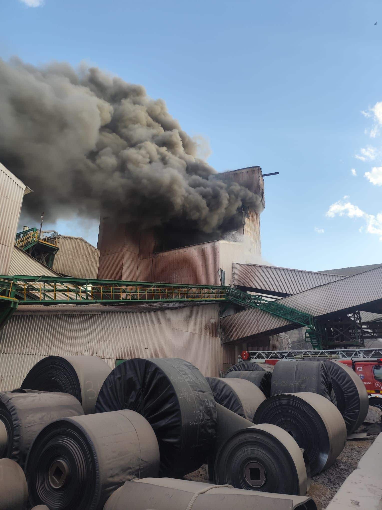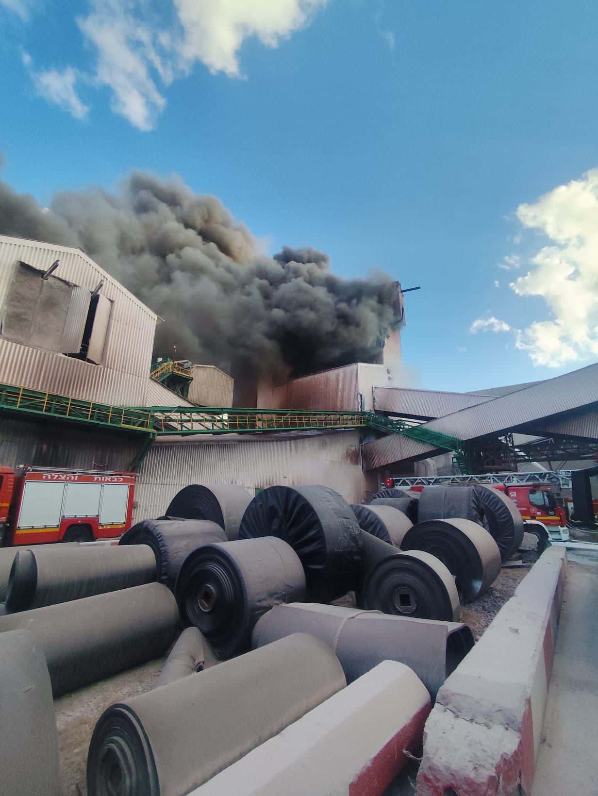 לוחמי האש של תחנת אשדוד פועלים בשריפה גדולה מאוד של מסוע פוספטים שנכנס לתוך בניין מיון ואכסנה.