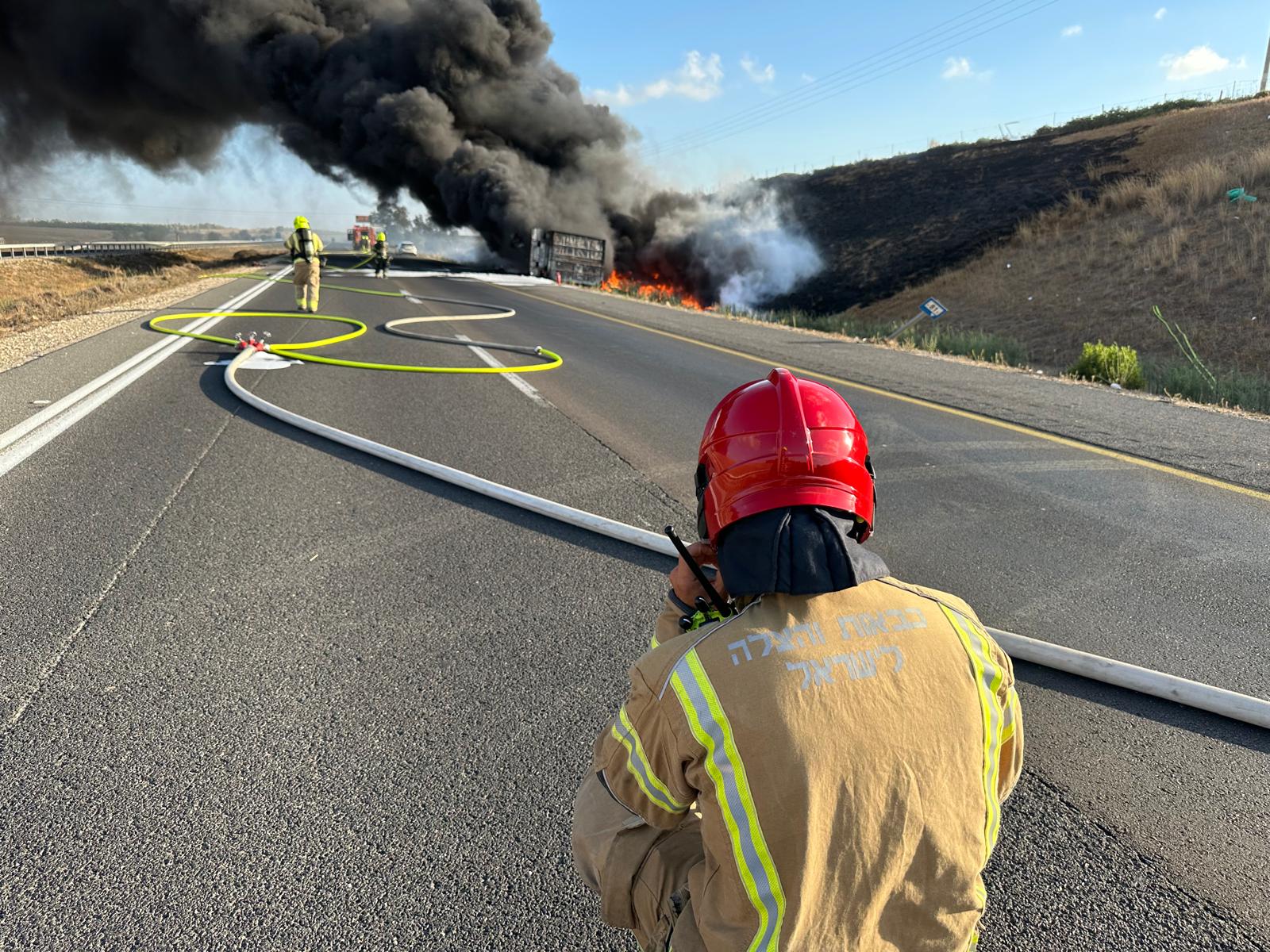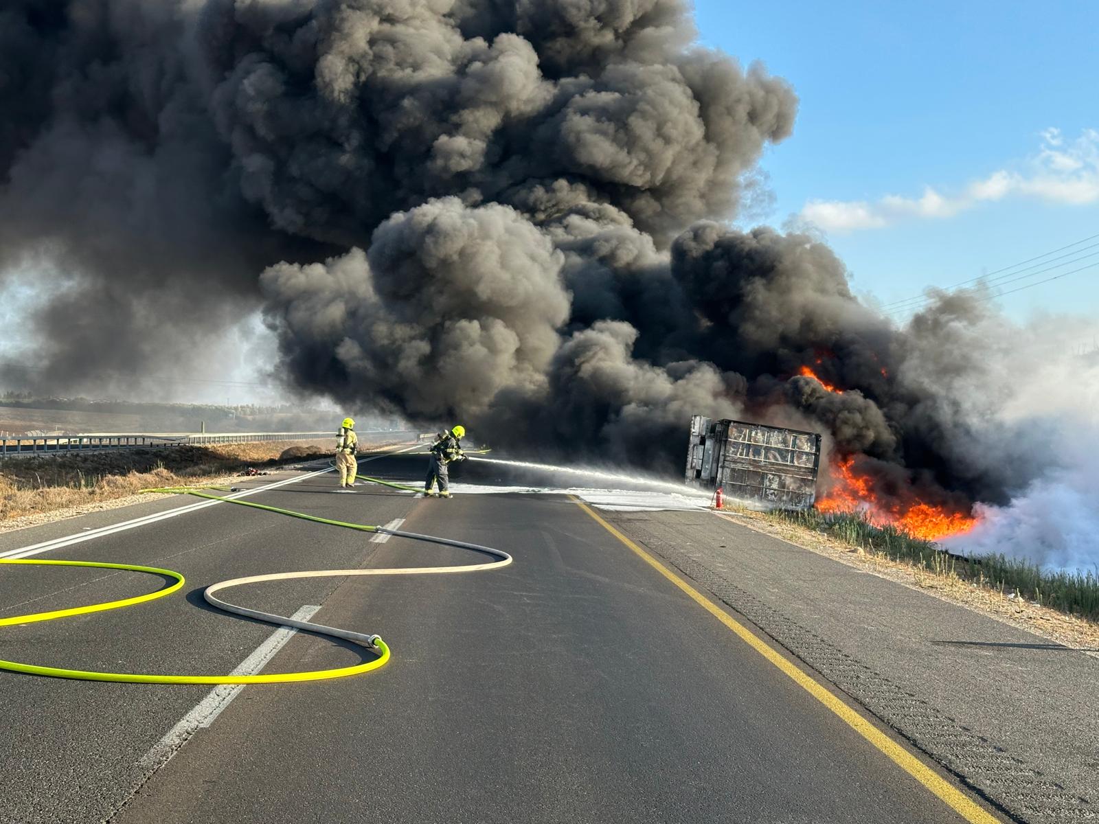 לפני זמן קצר התקבל דיווח במוקד 102 של מחוז דרום על שריפה במשאית המובילה חומרים מסוכנים בכביש 6, סמוך לקרית גת.