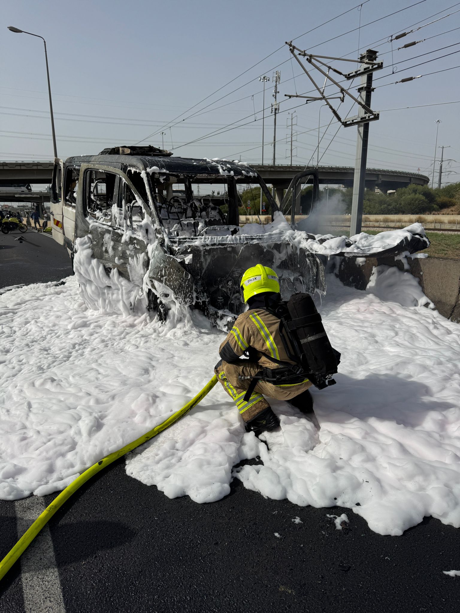 לוחמי האש פעלו בשריפת רכב לאחר תאונת דרכים בכביש 1 למזרח מגנות לשפירים.
