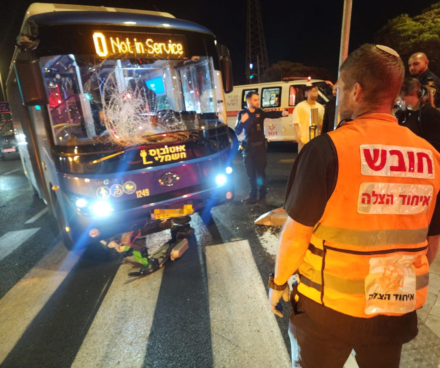 "מדובר בתאונה עם מעורבות אוטובוס ורוכב קורקינט חשמלי שנחבל קשות בראשו. בסיוע חובשים נוספים הענקנו לו סיוע רפואי ראשוני בזירה ולאחר מכן הוא פונה לבית החולים להמשך קבלת טיפול רפואי. מצבו בשלב זה מוגדר קשה".