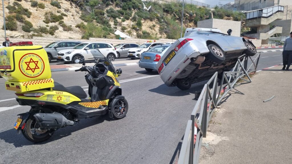 עם הגעתם למקום, הבחינו ברכב כשהוא נוטה על צידו ונשען על מעקה הבטיחות.